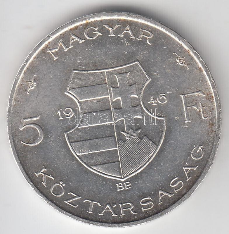 1946. 5Ft Ag "vastag Kossuth" plasztiktokban T:2 https://www.darabanth.com/de/179-Fernauktion/179.0/Numismatik/Ungarische-Munzen~300009/1946-5Ft-Ag-vastag-Kossuth-plasztiktokban-T2~II630626