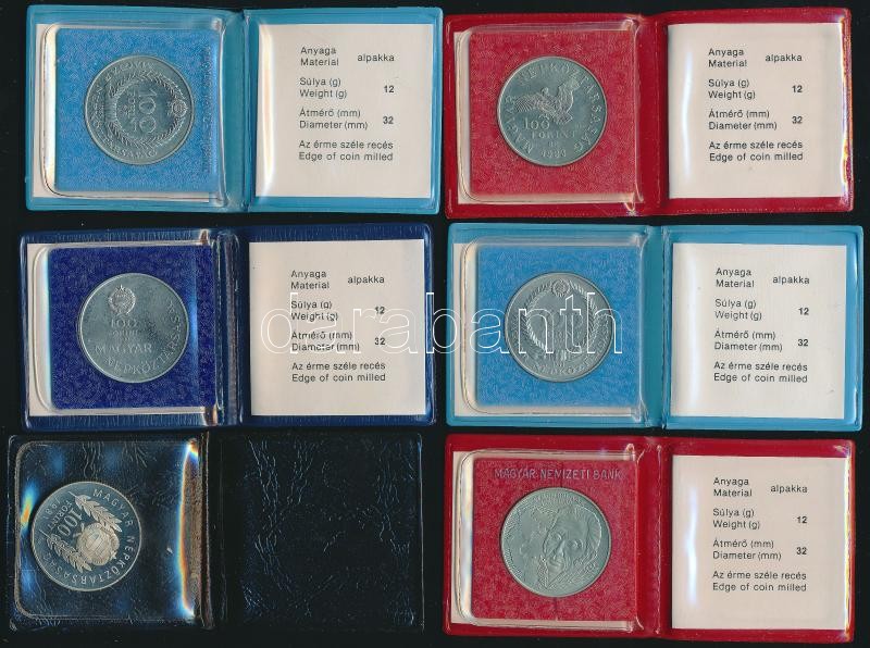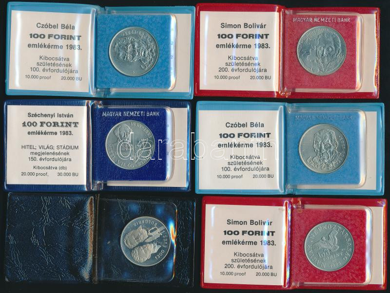 Beschreibung: 1981. 100Ft "Bulgária 1300 éves" T:PP + 1983. 100Ft "Széchenyi István" T:BU + 1983. 100Ft "Czóbel Béla" T:BU (2x) + 1983. 100Ft "Simon Bolivár" T:BU (2x), 5db eredeti tokban és tanúsítvánnyal!