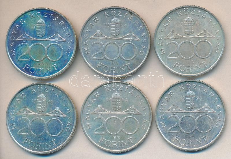 1994. 200Ft Ag "Deák" (6x) T:2 https://www.darabanth.com/de/179-Fernauktion/179.0/Numismatik/Ungarische-Munzen~300009/1994-200Ft-Ag-Deak-6x-T2~II631446