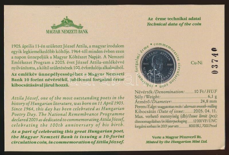 2005. 10Ft "József Attila" sorszámozott emléklapon T:1 https://www.darabanth.com/de/179-Fernauktion/179.0/Numismatik/Ungarische-Munzen~300009/2005-10Ft-Jozsef-Attila-sorszamozott-emleklapon-T1~II634138