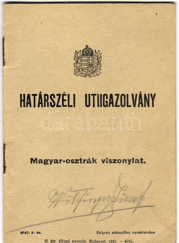 1938 Határszéli uti igazolvány https://www.darabanth.com/de/18-Fernauktion/18.0/Andere-Sammelgebiete/~210/1938-Hatarszeli-uti-igazolvany~II32425