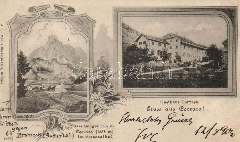 Corvara, Gasthaus Corvara / hotel, Sass Songer, floral https://www.darabanth.com/de/18-Gross-Auktion/18.1/Ansichtskarten-Ausland/Italien~6223/Corvara-Gasthaus-Corvara-hotel-Sass-Songer-floral~II846860