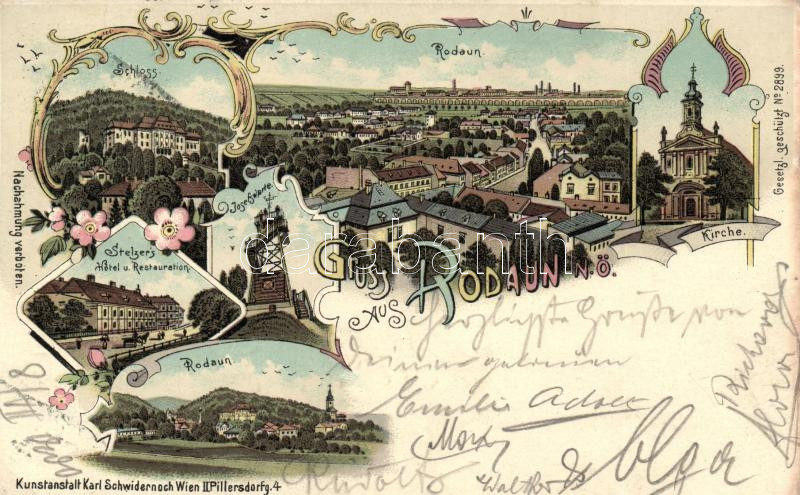Vienna, Wien XXIII. Rodaun, Schloss, Kirche, Josefswarte, Stelzer's Hotel un Restaurant / castle, church, lookout tower, hotel, retaurant, Karl Schwidernoch, Art Nouveau, litho (EK)