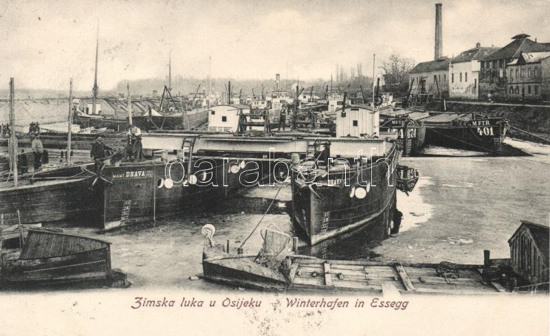 Eszék, Essegg, Osijek; Zimska Luka (Winterhafen) / winter port, Dráva ... https://www.darabanth.com/de/18-Gross-Auktion/18.1/Ansichtskarten-Ungarn/Kroatien~6150/Eszek-Essegg-Osijek-Zimska-Luka-Winterhafen-winter-port-Drava-ships~II853644