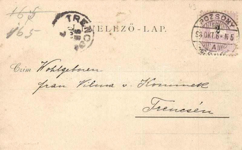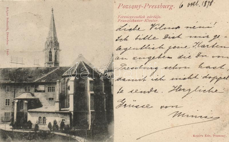 1898 Pozsony, Pressburg, Ferences zárda / Franciscan cloister (fl) https://www.darabanth.com/de/18-Gross-Auktion/18.1/Ansichtskarten-Ungarn/Slowakei~6148/1898-Pozsony-Pressburg-Ferences-zarda-Franciscan-cloister-fl~II840187