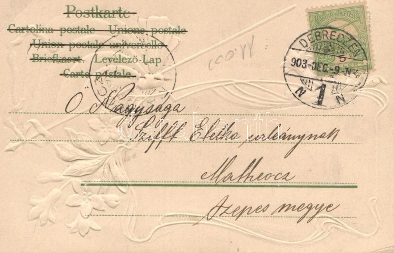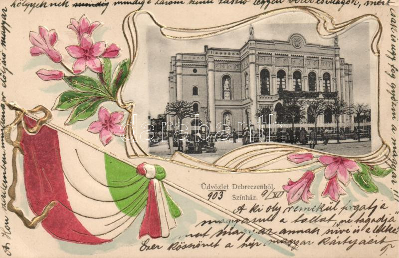 Debrecen, Színház, zászló, arany díszítés Emb. litho (EK) https://www.darabanth.com/de/18-Gross-Auktion/18.1/Ansichtskarten-Ungarn/Ungarn~6146/Debrecen-Szinhaz-zaszlo-arany-diszites-Emb-litho-EK~II855313