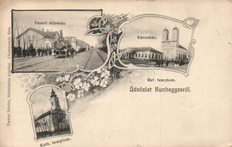 Beschreibung: Kunhegyes, vasútállomás, városház, katolikus templom; Farkas Sándor fényképész kiadása, floral