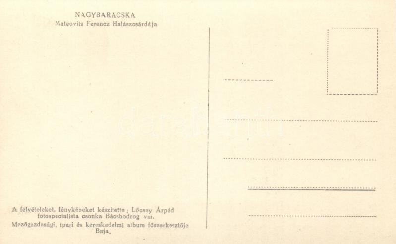 Nagybaracska, Mateovits Ferenc halászcsárdája https://www.darabanth.com/de/18-Gross-Auktion/18.1/Ansichtskarten-Ungarn/Ungarn~6146/Nagybaracska-Mateovits-Ferenc-halaszcsardaja~II844662