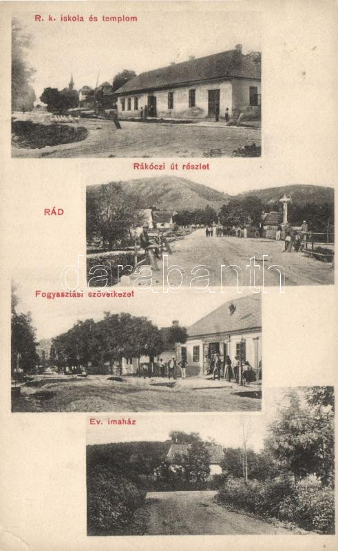 Beschreibung: Rád, Római katolikus iskola és templom, Rákóczi út, Fogyasztási szövetkezet, Evangélikus imaház (EK)