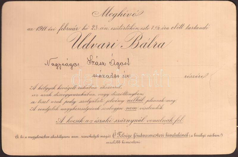 1911 Meghívó udvari bálra, Szász Ágosot százados részére / Invitation ... https://www.darabanth.com/de/18-Gross-Auktion/18.1/Kunst-Dokumente/Drucksachen~5910/1911-Meghivo-udvari-balra-Szasz-Agosot-szazados-reszere-Invitation-for-royal-ball-19x13-c~II847500