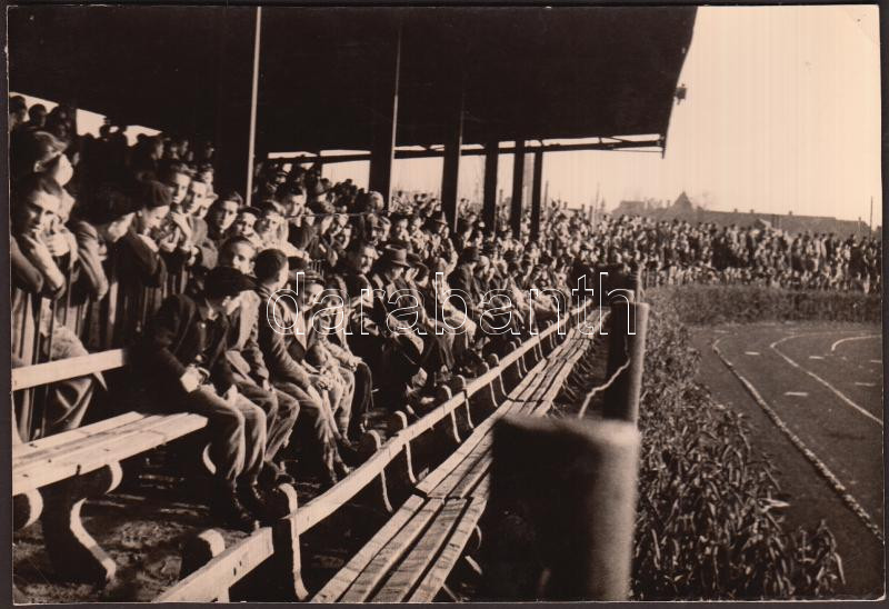 1955. november 13. Kozák Lajos (1906-1975): Győr, 4.000 néző a Spartakusz S. E. győri meghívásos atlétikai versenyén, pecséttel jelzett, feliratozott vintage fotó, 12x17 cm