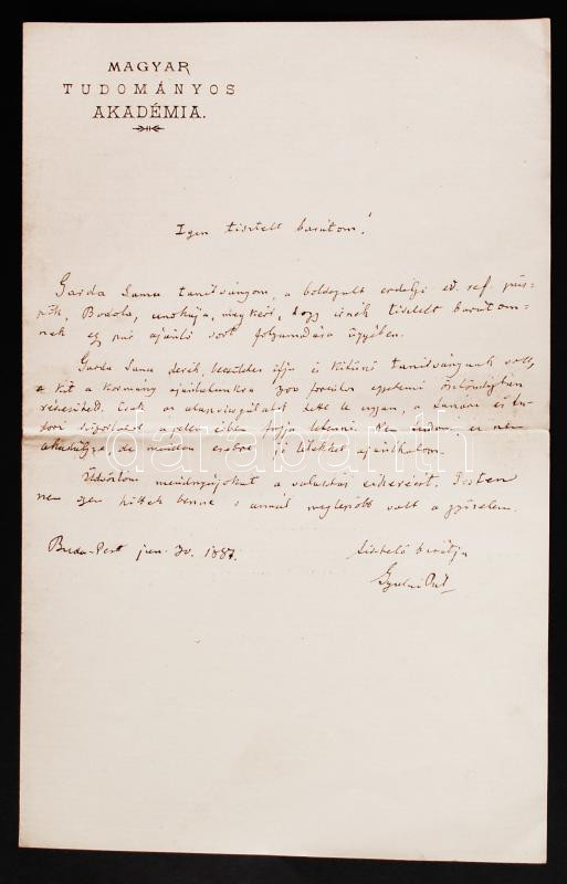 1887 Gyulai Pál (1826-1909), a Magyar Tudományos Akadémia elnökének sa... https://www.darabanth.com/de/18-Gross-Auktion/18.1/Kunst-Dokumente/Historische-Dokumenten-Handschriften~6143/1887-Gyulai-Pal-1826-1909-a-Magyar-Tudomanyos-Akademia-elnokenek-sajat-kezzel-irt-levele-~II824555