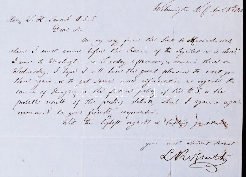 Védett! 1852 Kossuth Lajos saját kézzel írt levele William Henry Seward amerikai külügyminiszternek, melyben értesíti, hogy meglátogatja és alkalmuk nyílik beszélni a magyar ügyről az USA külpolitikájában /