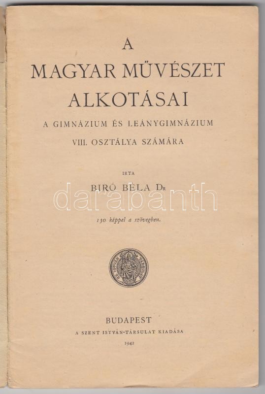 Dr. Biró Béla: A magyar művészet alkotásai. VIII osztály számára. Buda... https://www.darabanth.com/de/180-Fernauktion/180.0/Andere-Sammelgebiete/Bucher-Architektur-Kunst~400033/Dr-Biro-Bela-A-magyar-muveszet-alkotasai-VIII-osztaly-szamara-Budapest-1942-Szent-IstvC3~II637875