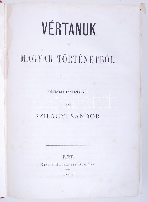 Szilágyi Sándor: Vértanuk a magyar történetből. Történeti tanulmányok.... https://www.darabanth.com/de/180-Fernauktion/180.0/Andere-Sammelgebiete/Bucher-Geschichte~400028/Szilagyi-Sandor-Vertanuk-a-magyar-tortenetbol-Torteneti-tanulmanyok-Pest-1867-Heckenas~II638627