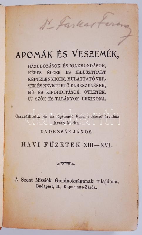 Adomák és veszemék, hazudozások és igazmondások, képes élcek és illusztrált képtelenségek, mulattató versek és nevettető elbeszélések ... Összeáll. és kiadta Dvorzsák János. Havi füzetek XIII.-XVI. 1908. Festett egészvászon kötésben (Pausz Gyula)