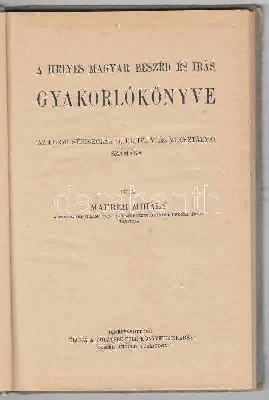 Maurer Mihály: A helyes magyar beszéd és írás gyakorlókönyve. Temesvár... https://www.darabanth.com/de/180-Fernauktion/180.0/Andere-Sammelgebiete/Bucher-Sonstige-Raritaten~400036/Maurer-Mihaly-A-helyes-magyar-beszed-es-iras-gyakorlokonyve-Temesvar-1911-Polatsek-fele-~II638019
