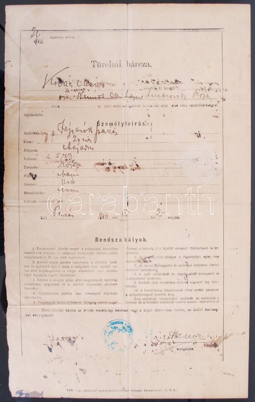 1914 Türelmi bárca kéjnő részére a fontosabb szabályokkal, hátoldalán ... https://www.darabanth.com/de/180-Fernauktion/180.0/Andere-Sammelgebiete/Dokument~400014/1914-Turelmi-barca-kejno-reszere-a-fontosabb-szabalyokkal-hatoldalan-betelt-orvosi-szemlel~II639434