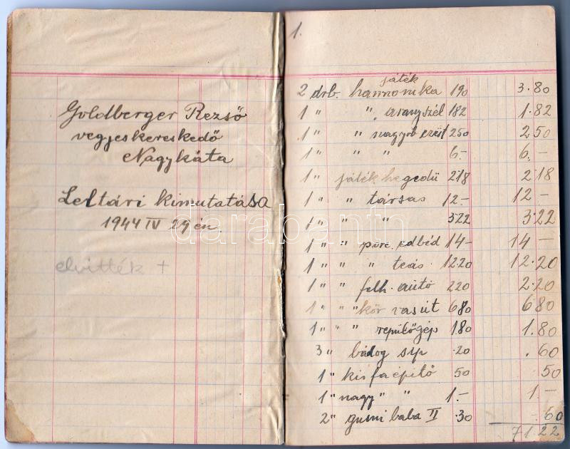 1944 Nagykáta Goldberger Rezső vegyeskereskedő kézzel írt leltári kimu... https://www.darabanth.com/de/180-Fernauktion/180.0/Andere-Sammelgebiete/Dokument~400014/1944-Nagykata-Goldberger-Rezso-vegyeskereskedo-kezzel-irt-leltari-kimutatasa-jegyzetfuzetben~II640111