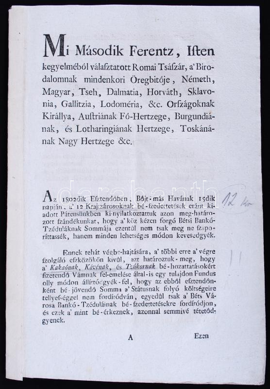 1802 A bécsi bankó cédulákban szedett kakaó, kávé és cukorvám rendelet... https://www.darabanth.com/de/180-Fernauktion/180.0/Andere-Sammelgebiete/Drucksachen~400025/1802-A-becsi-banko-cedulakban-szedett-kakao-kave-es-cukorvam-rendelet-magyar-nyelven-16p~II639425
