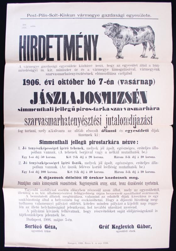 Beschreibung: 1906 Jászlajosmizse szarvasmarha vásár hirdetmény 32x44 cm