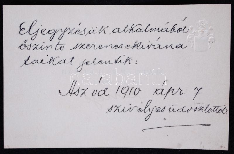 Beschreibung: 1910 Az aszódi főjegyző címeres névjegykártyája eljegyzési jókívánságaival