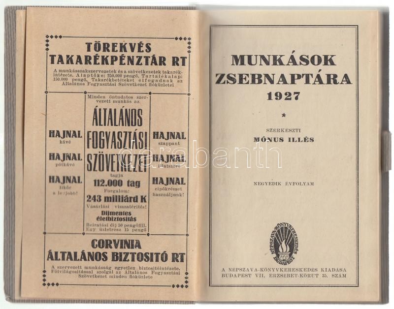 1927 Mónus Illés: Munkás zsebnaptára. reklámokkal tolltratóval https://www.darabanth.com/de/180-Fernauktion/180.0/Andere-Sammelgebiete/Drucksachen~400025/1927-Monus-Illes-Munkas-zsebnaptara-reklamokkal-tolltratoval~II638834