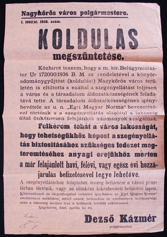 1938 Nagykőrös városi rendelet a koldulás megszüntetése tárgyában 32x4... https://www.darabanth.com/de/180-Fernauktion/180.0/Andere-Sammelgebiete/Drucksachen~400025/1938-Nagykoros-varosi-rendelet-a-koldulas-megszuntetese-targyaban-32x48-cm~II640067