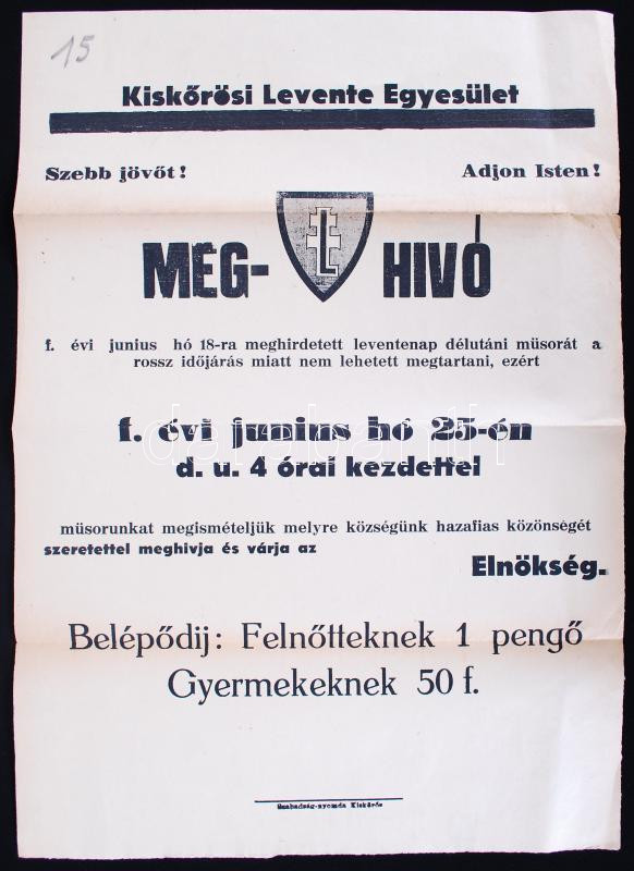 cca 1939 Kiskörösi Levente Egyesület plakát 30x40 cm https://www.darabanth.com/de/180-Fernauktion/180.0/Andere-Sammelgebiete/Drucksachen~400025/cca-1939-Kiskorosi-Levente-Egyesulet-plakat-30x40-cm~II640124
