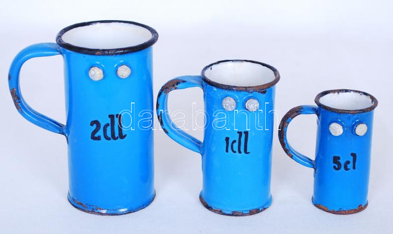 Beschreibung: Ital kimérő szett 3 db (0,5 dl,1 dl,2 dl), zománcozott vas, jelzett Kőbányai Zománcárugyár cca 1950, kis lepattanásokkal