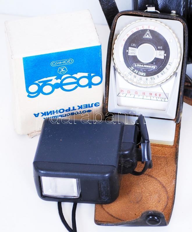 Photo camera in original case, flash and light meter