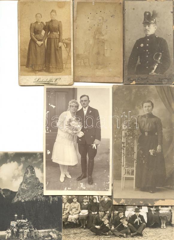 Beschreibung: 4 db kemény hátú fotó és 3 db sima fotó, háború előttiek, egy katonai fotóval, összesen:7 db