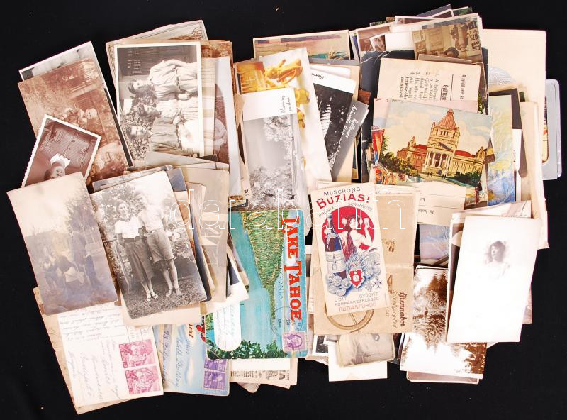 Beschreibung: Nagy vegyes, nagyrlszt fotókat, fotólapokat tartalmazó tétel kevés filatéliával, nyomtatvánnyal. Egy cipősdobozban