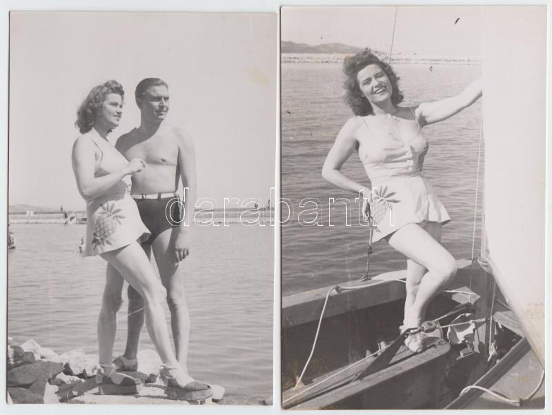 Beschreibung: cca 1940 3db balatoni fotó Karády Katalinról, többek között Nagy István színművész társaságában, 12x18cm