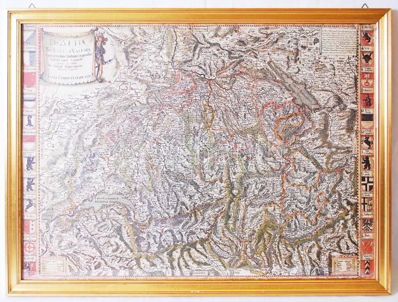 Beschreibung: H.C. Gyger sorszámozott újra kiadott fakszimile 1635-ös Svájc térképe, üvegezett keretben 52×70 cm / Faksimile map from H.C. Gyger