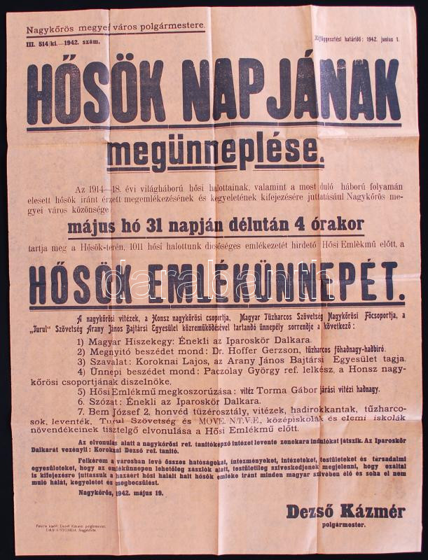 Beschreibung: 1942 Nagykőrös hősök napja plakát 47x32 cm