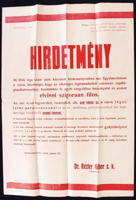1944 Légoltalmi hirdetmény a fel nem robbant bombák tárolásával kapcso... https://www.darabanth.com/de/180-Fernauktion/180.0/Andere-Sammelgebiete/Militaria~400023/1944-Legoltalmi-hirdetmeny-a-fel-nem-robbant-bombak-tarolasaval-kapcsolatban-40x60-cm~II639158