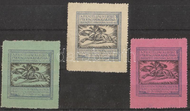 Beschreibung: 1930 3 klf színű Filatéliai kurir propaganda kiállítás levélzáró