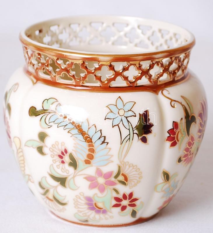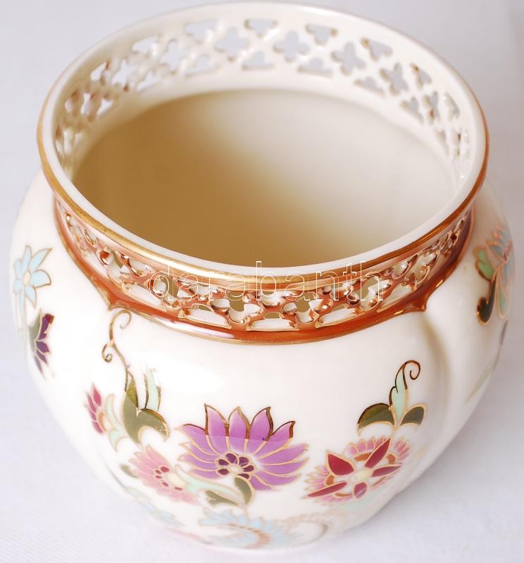 Kézzel festett Zsolnay áttört kis kaspó, jelzett, hibátlan / Hand pain... https://www.darabanth.com/de/180-Fernauktion/180.0/Andere-Sammelgebiete/Porzellan~400007/Kezzel-festett-Zsolnay-attort-kis-kaspo-jelzett-hibatlan-Hand-painted-Zsolnay-vase-m10-cm-~II638588