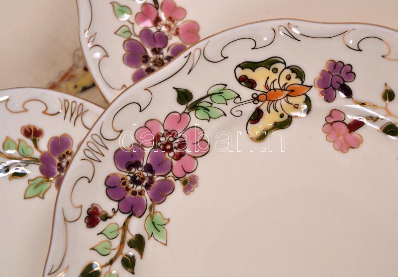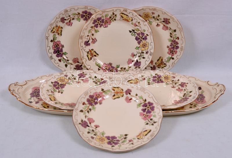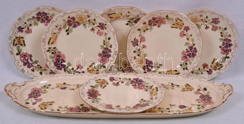 Beschreibung: Zsolnay pillangó mintás süteményes készlet, kézzel festett, jelzett, összesen: 7db / Zsolnay cake set