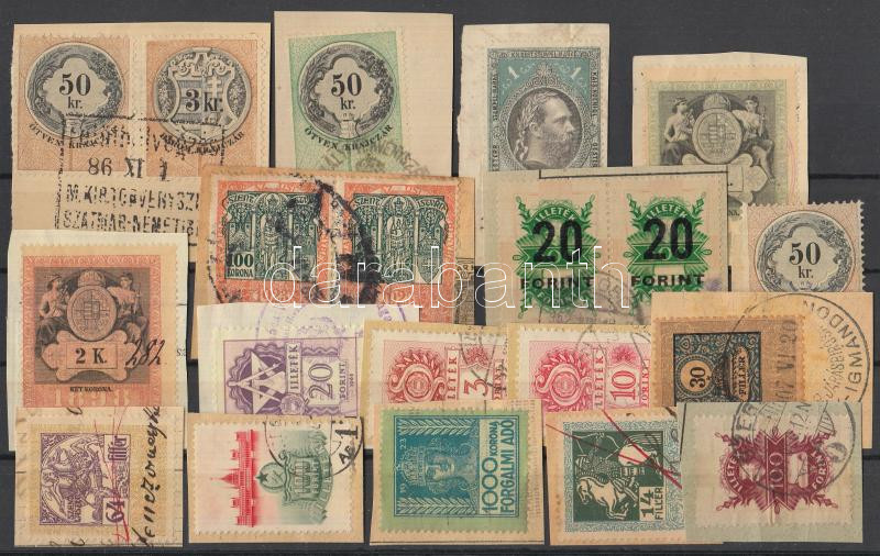 Beschreibung: 17 db illetékbélyeg kivágásokon, közte összefüggések