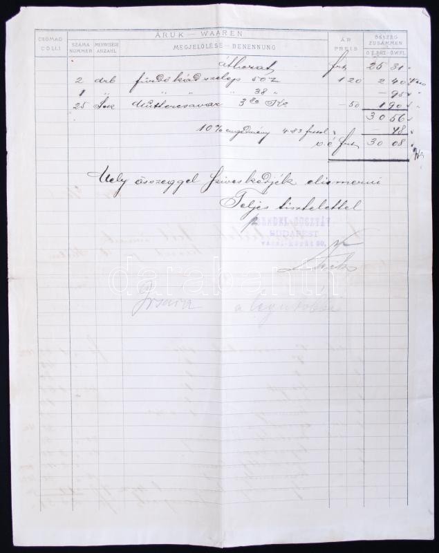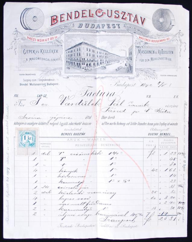 Beschreibung: 1892 Budapest V. Bendel Gusztáv malomipari szaküzlet számla