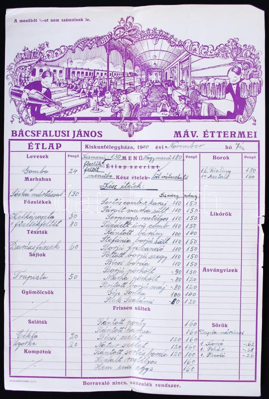1940 Kiskunfélegyháza MÁV étterem étlap https://www.darabanth.com/de/180-Fernauktion/180.0/Andere-Sammelgebiete/Werbungen~400018/1940-Kiskunfelegyhaza-MAV-etterem-etlap~II639386