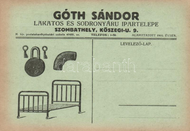 Góth Sándor szombathelyi lakatos és sodronyáru ipartelepének reklámja ... https://www.darabanth.com/de/180-Fernauktion/180.0/Ansichtskarten/Werbungen~800085/Goth-Sandor-szombathelyi-lakatos-es-sodronyaru-ipartelepenek-reklamja-the-advertisement-of-t~II638593