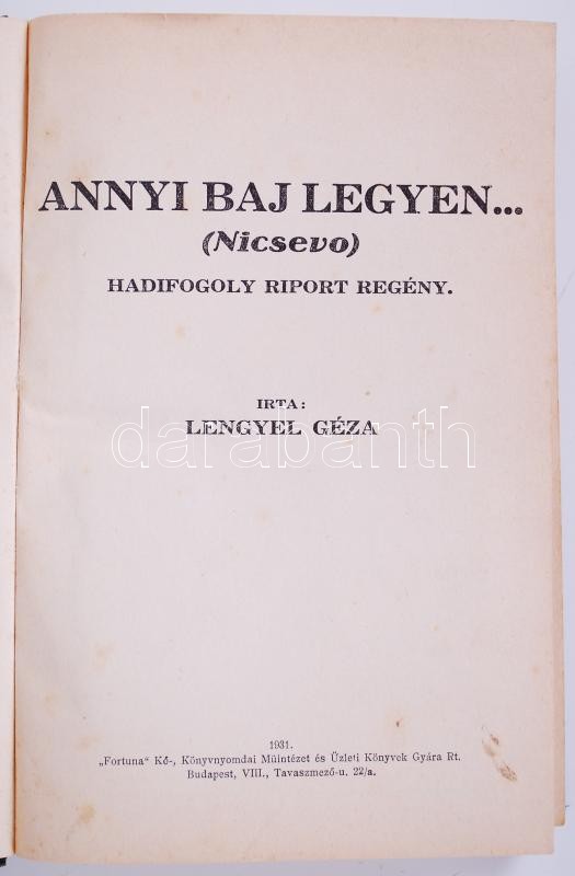Frontregények: Lengyel Géza: Annyi baj legyen (NIcsevo) Bp., 1931. Pan... https://www.darabanth.com/de/181-Fernauktion/181.0/Andere-Sammelgebiete/Bucher-Militaria~200008/Frontregenyek-Lengyel-Geza-Annyi-baj-legyen-NIcsevo-Bp-1931-Pantheon-Egeszvaszon-kotes~II648772