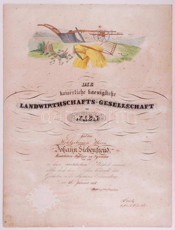 1856 A Bécsi Mezőgazdasági Társaság tagsági oklevél Siebenfreud nagyszombati kertész részére. Kőnyomat. /