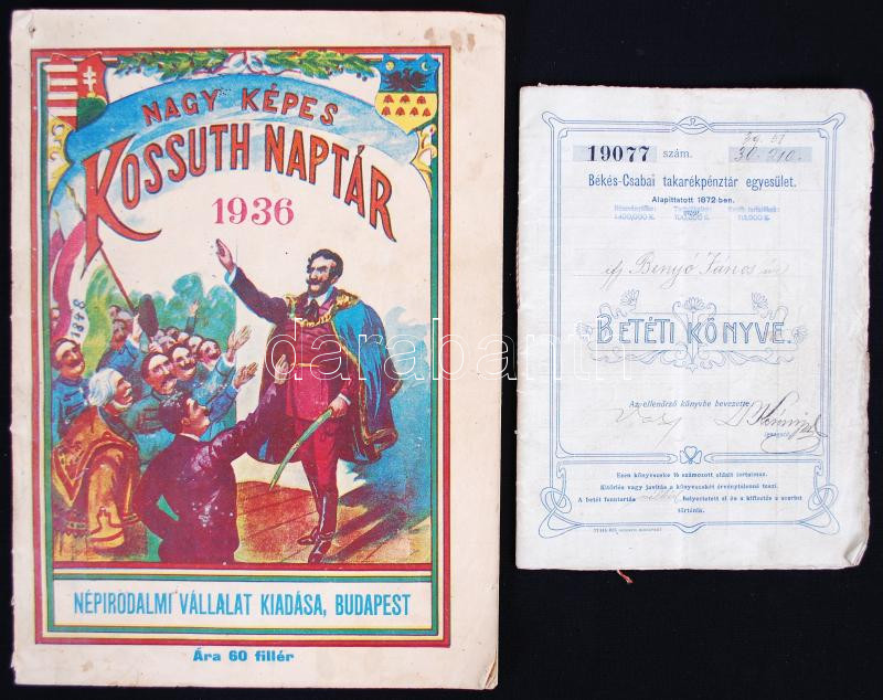 1912 Békés-Csabai takarékpénztár egyesület. Betéti könyve és egy Kossu... https://www.darabanth.com/de/181-Fernauktion/181.0/Andere-Sammelgebiete/Dokument~200034/1912-Bekes-Csabai-takarekpenztar-egyesulet-Beteti-konyve-es-egy-Kossuth-naptar-1936-bol~II649226