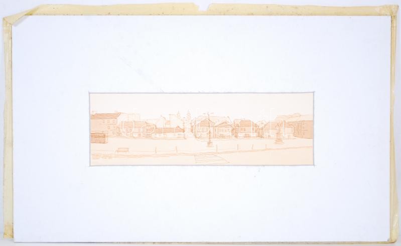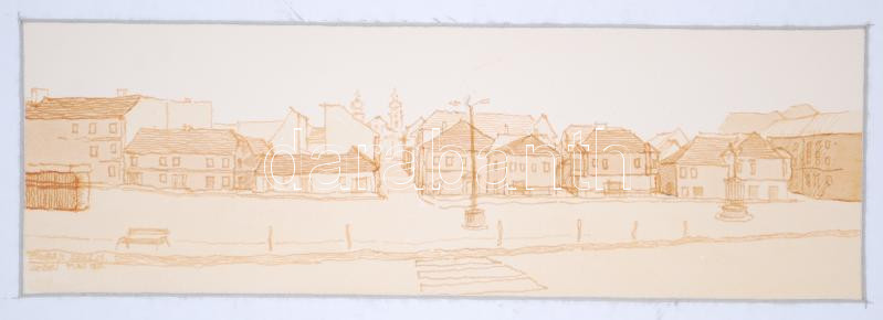 Beschreibung: Csobaji Zsolt: A győri piactér. Tus, papír, 10×29 cm