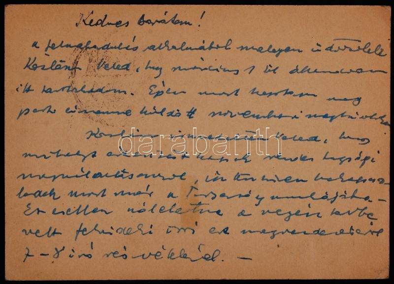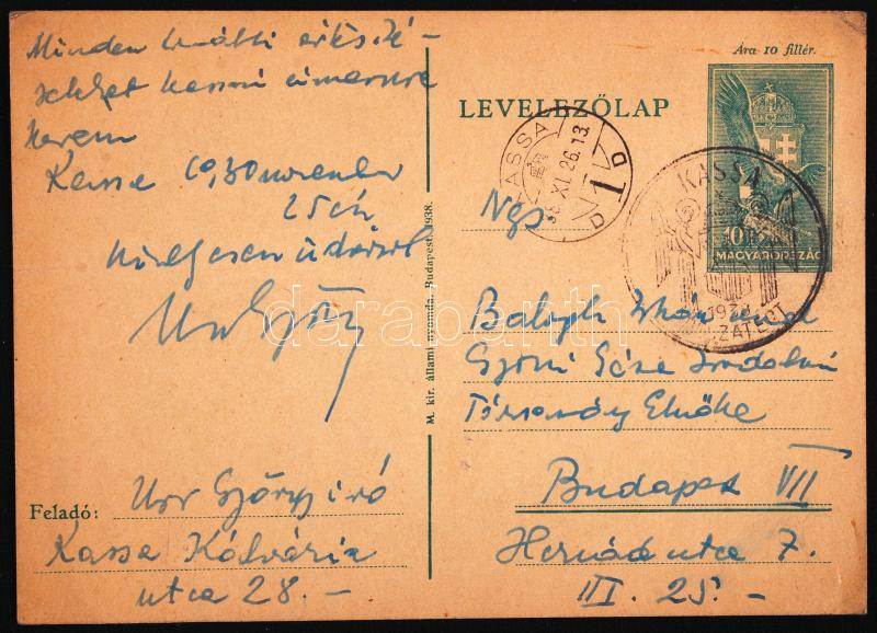 1938 Vír György felvidéki magyar író, szobrász saját kézzel írt levelezőlapja