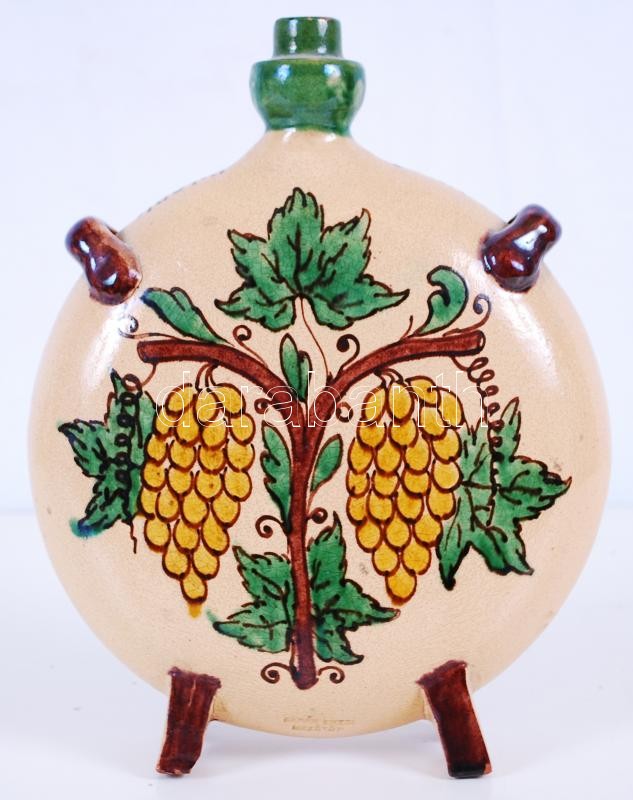 Beschreibung: Badár Erzsi (1889-1985) jelzett, kézzel festett, mázas kerámia kulacs (lábain sérült) /